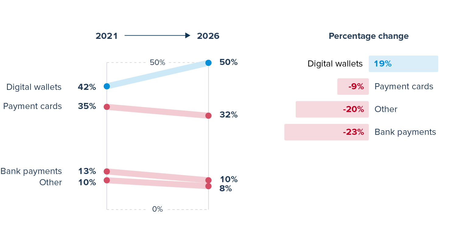 In terms of deposits made from consumers to gambling merchant accounts in Europe, Edgar, Dunn & Company expects the total share of digital wallet usage to increase from 42% in 2021 to 50% in 2026, while total share for all other payment methods will slightly decline. In several European markets like the UK, iGaming operators are banned by regulators from accepting deposits by credit card because of the potential for vulnerable players to fall into debt.