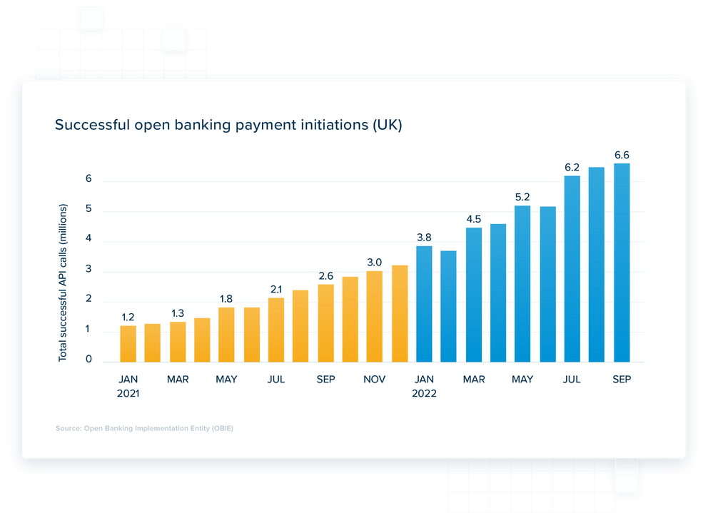 While the UK continues to lead the way in open banking adoption, there are now 58 countries rolling out open banking technology based on PSD2 or similar legislation. Germany, France and Italy are all on track to pass 1 billion open banking application programming interface (API) calls per month by the end of 2022. API calls are messages sent to a server asking an API to provide information or perform an action, showing that the demand for open banking services — including payments — are growing in these countries.