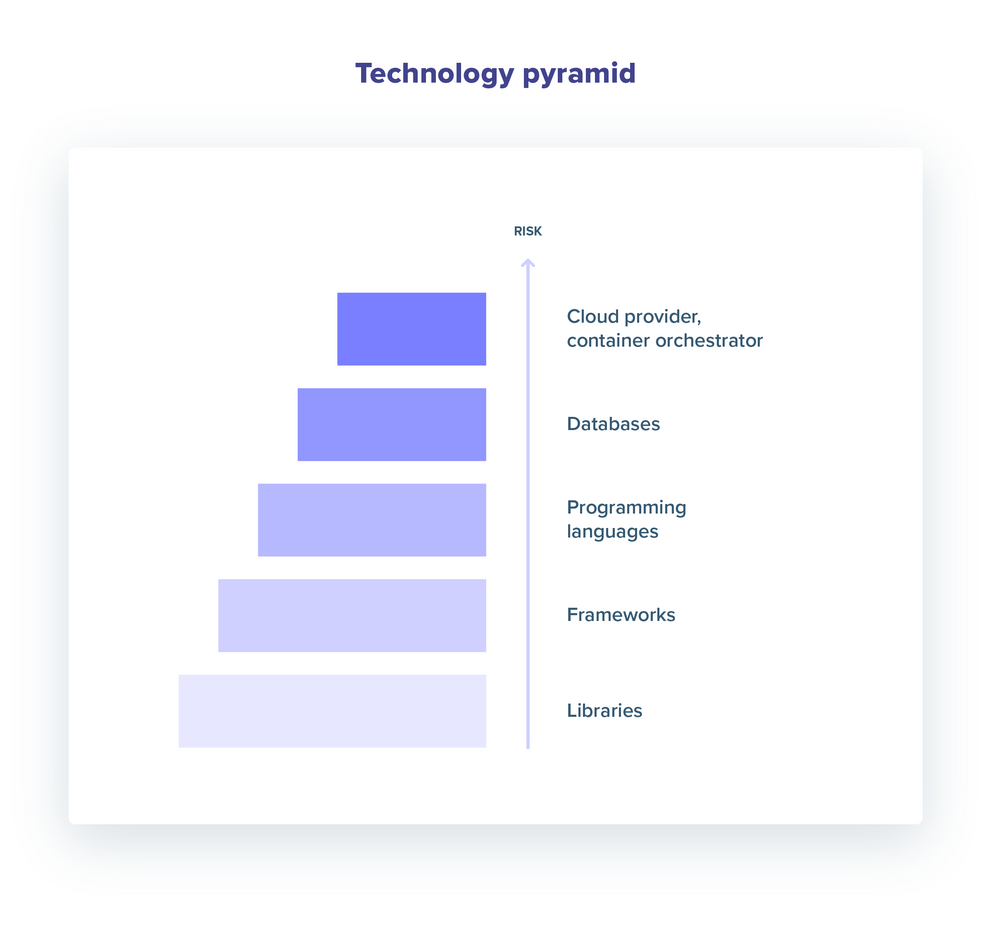 It helps to break down and visualise your technology stack as a pyramid.You will only use a handful of technologies from the categories closer to the top (often just one!), while you will have several examples for the categories closer to the bottom.The position within the pyramid roughly correlates with how expensive it would be to change your mind: swapping out an authentication library is going to be orders of magnitude cheaper than migrating your whole stack to a new Cloud provider.We can therefore use the relative position of a new technology in the pyramid as a first-level approximation of its cost in terms of innovation tokens.The pyramid helps us to determine who should be involved in the conversation – a team can autonomously decide to introduce a new library, but the adoption of a new database most definitely requires a broader audience. The CTO/VP of Engineering must be involved if we are discussing the adoption of a new programming language or experimenting with a new cloud provider.Looking again at the technology pyramid, you may ask – is it ever reasonable to bet on a new programming language or a new cloud provider for a project?Unique requirements are often the driver for early adoption – the new technology is a key enabler for a unique value proposition and adoption is seen as a safer route compared to the risks and cost of building and operating a custom in-house solution.Looking back, the genesis and adoption of Erlang within the telecommunications industry is a textbook example. More recently, the migration from in-house data centres to public cloud providers.