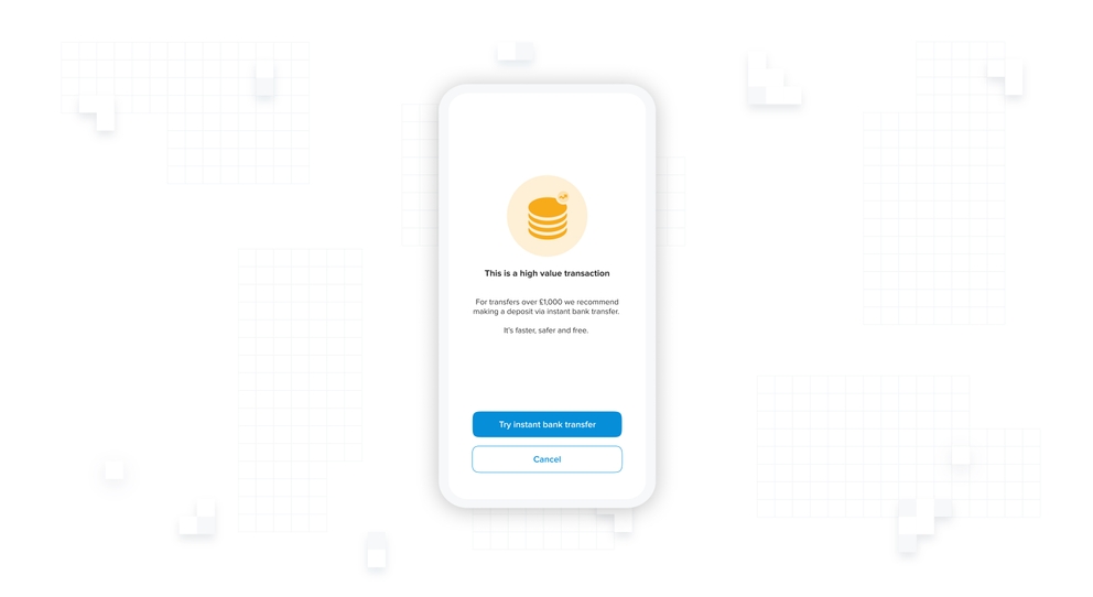 High value transactionsSecurity is one of the main the concerns when it comes to moving money — and that concern is 10x’d for high value deposits. Consider recommending instant bank transfer as the safer and more convenient option for deposits over a certain threshold.