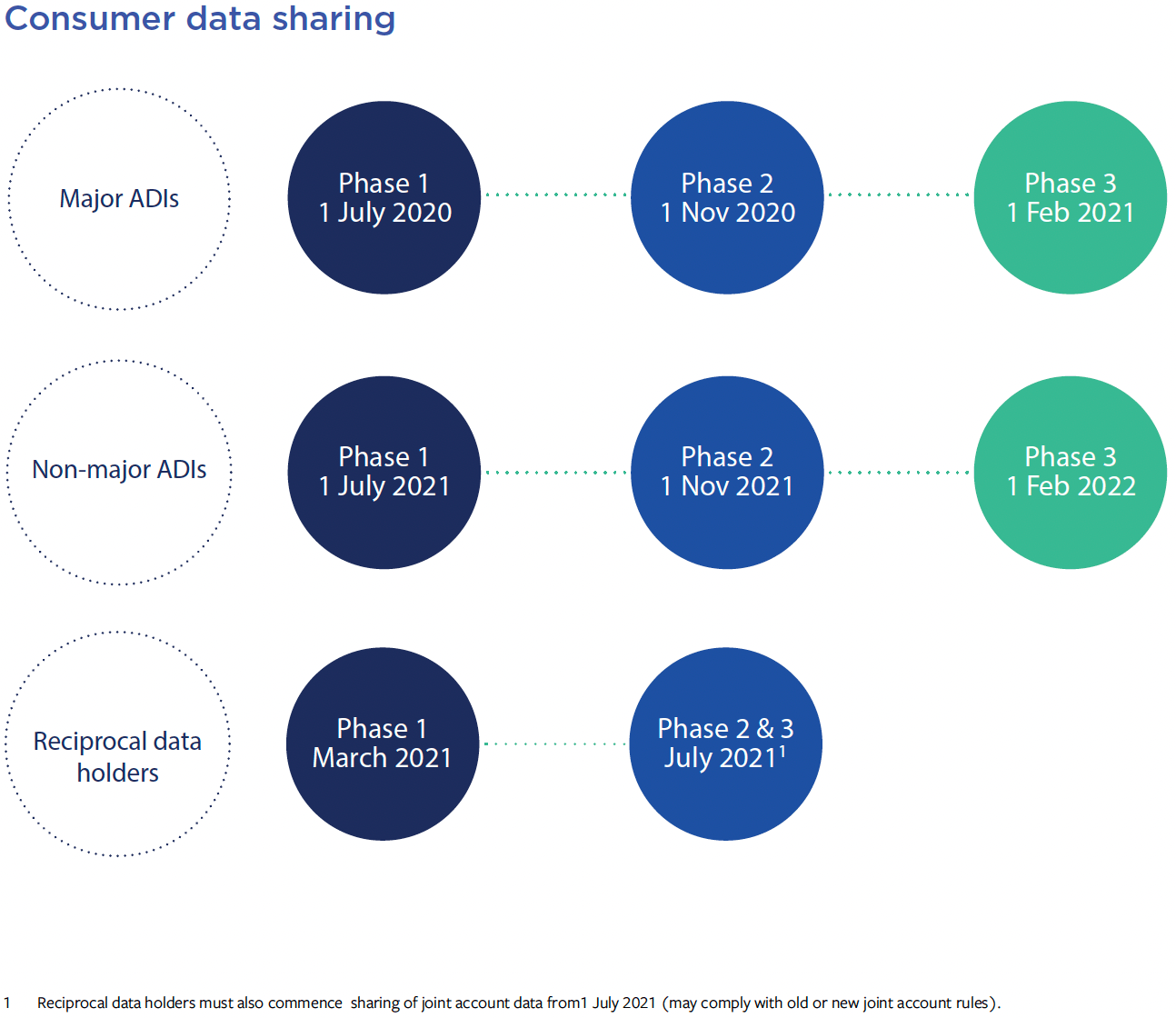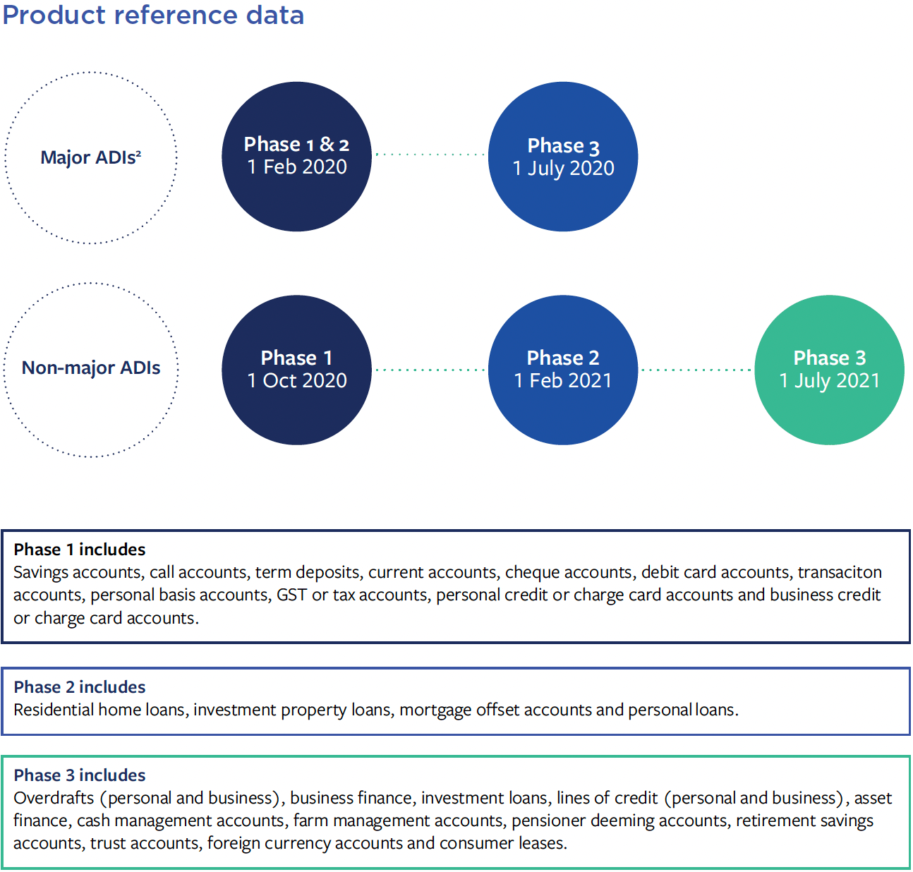 Open banking in Australia kicked off in 2020, with a phased rollout covering products including transaction accounts, term deposits, credit cards, loans, mortgages, trade finance, and lines of credit. 1 July 2020: Open banking starts for major banks with the inclusion of Phase 1 products, such as credit cards, transaction accounts, term deposits for major banks. 1 November 2020: Launch of open banking with major banks for Phase 2 products, including a limited range of credit products such as mortgages.1 February 2021: The final phase of the rollout for major banks.March 2021: Reciprocal Data Holders are included in the Phase 1 rollout.1 July 2021: Non-major Authorised Depository Institutions (ADIs) are included in the Phase 1 rollout. Reciprocal Data Holders launch their open banking phase 2 & 3 stages.1 November 2021: Non-major ADIs roll out Phase 2.1 February 2022. Launch of open banking with non-major ADIs for products such as business and investment accounts. Phase 1: Savings accounts, call accounts, term deposits, current accounts, cheque accounts, debit card accounts, transaction accounts, personal basis accounts, GST or tax accounts, personal credit or charge card accounts and business credit or charge card accounts.Phase 2: Residential home loans, investment property loans, mortgage offset accounts and personal loans.Phase 3: Overdrafts (personal and business), business finance, investment loans, lines of credit (personal and business), asset finance, cash management accounts, farm management accounts, pensioner deeming accounts, retirement savings accounts, trust accounts, foreign currency accounts and consumer leases.